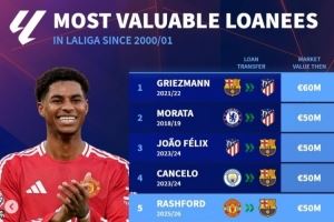 西甲新世纪租将身价榜:格子居首,莫拉塔&菲利克斯&拉什福德在列